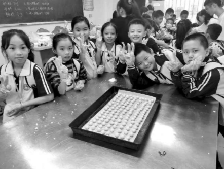 老师说按6个人一组分好,几个大姐姐已经等我们就位啦。姐姐教我们怎么取完整的蛋黄,黄油搅好加入蛋黄,再把糖粉、椰蓉、奶粉、低筋面粉倒下去,姐姐边搅边让我们看,示范完她让小记者一个一个轮流搅拌。完成了,姐姐跟我们说:“我们把它搓成一个小圆球。看,差不多就这样大。”我们齐心协力搓完了所有小球。大姐姐帮我们把一个个小球摆整齐,之后就放烤箱了。