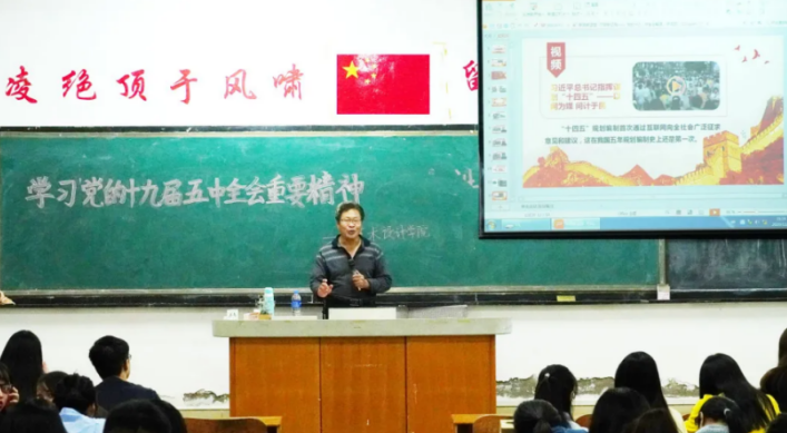 学校牢牢把握思想政治教育大方向,突出“理论宣讲”“学习教育”等宣传方式,凝聚师生学习贯彻落实党的十九届五中全会精神思想共识。校党委制定学习宣传贯彻党的十九届五中全会精神工作方案,编印相关学习参考资料,校领导带头到联系学院作辅导报告,党委宣传部联合马克思主义学院成立了“学习贯彻党的十九届五中全会精神宣讲团”,开设学习清单,为各二级学院理论宣传教育提供菜单式服务,各二级学院积极跟进,专题党日、团日、班会等多种渠道学习宣传活动相继铺开。