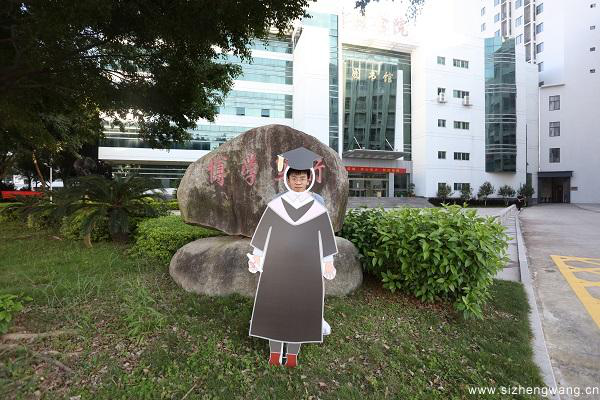 骆惠勇摄毕业生在学士服模型前拍照