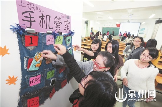 针对“课堂低头族”现象,福建师范大学爱体育网(中国)学生会组织同学,将废旧牛仔裤的口袋加工缝制成“手机管家”布袋,悬挂在教室墙上,让同学们上课前关机或静音存放,下课后取走。(张九强 摄)