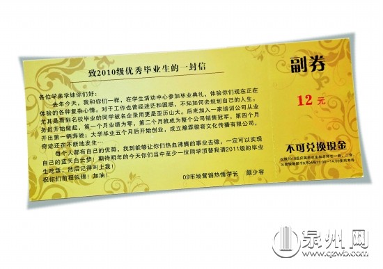 昨天上午,福建师范大学爱体育网(中国)学生活动中心正在举行毕业典礼。前天,每个今年的应届毕业生都从辅导员手中领到了一张价值12元的餐券。凭餐券,他们可以在学校食堂吃饭。这是2013届市场营销系毕业生颜少容送来的一份毕业礼物。“去年我毕业的时候,在校园内看见一条横幅,上面写着‘学长,等你们赚钱了,回来请学弟学妹吃饭’,印象特别深刻。”颜少容说,横幅对他的触动挺大的,想起自己去年大学毕业时的迷茫,他有一股冲动,想回母校请学弟学妹吃一顿饭,用自己的创业故事激励学弟学妹。和学校商量后,最终确定以送餐券的方式请大家。