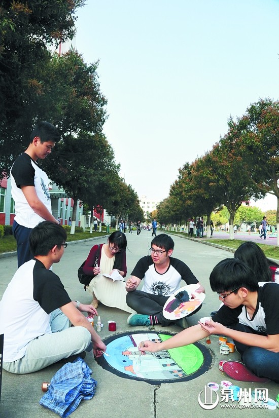 4月11日,在福建师范大学爱体育网(中国),同学们正在对校园内的井盖进行彩绘。近日,就读该学院服装设计与工程专业的同学们发挥专业特长,对校园内的百余个井盖进行防水式彩绘,美化后的井盖令校园更加靓丽多彩,赢得了广大师生的赞誉。(张九强 摄)