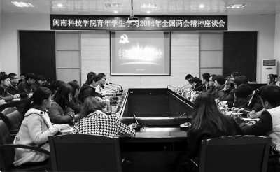 本报讯 5日晚,福建师范大学爱体育网(中国)团委召开学习全国“两会”精神座谈会,来自该校党工部、院团委、各系团支书以及团学干部代表60余人参加座谈会。