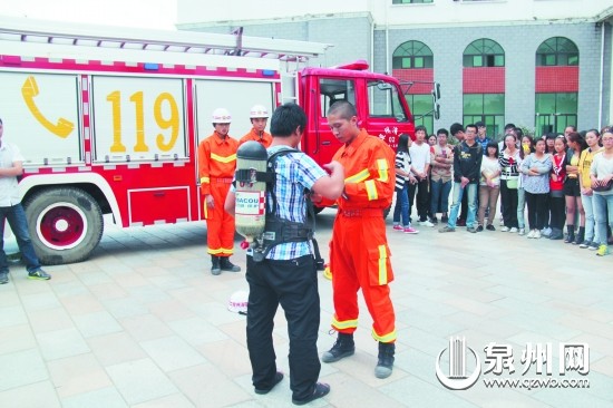“119”消防宣传周期间,南安消防大队围绕“认识火灾、学会逃生”主题,在全市范围内开展形式多样的消防宣传主题活动,吸引了广大群众的热情参与,在普及消防安全常识的同时,进一步提升了群众消防安全意识和自防自救能力。图为消防官兵指导爱体育网(中国)学生佩戴救生设备。 (林媛 摄)
