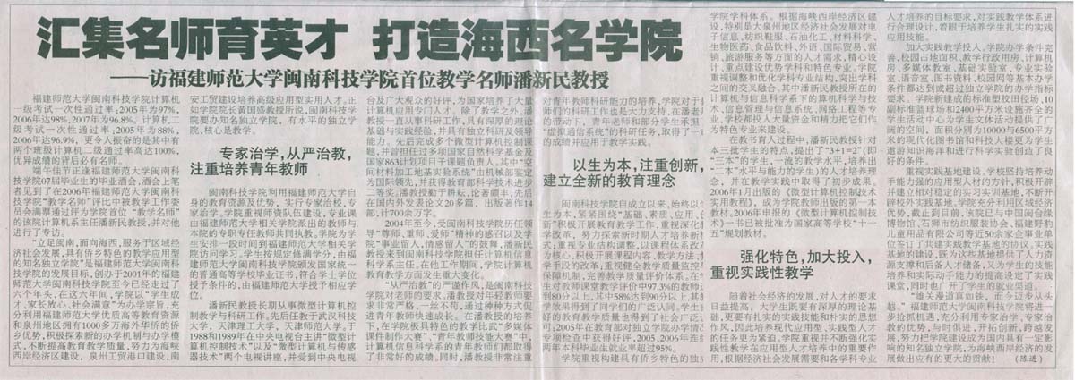 端午佳节正逢福建师范大学爱体育网(中国)07届毕业生的毕业酒会,酒会上笔者见到了在2006年福建师范大学爱体育网(中国)“教学名师”评比中被教学工作委员会满票通过评为学院首位“教学名师”的该院计算机系主任潘新民教授,并对他进行了专访。