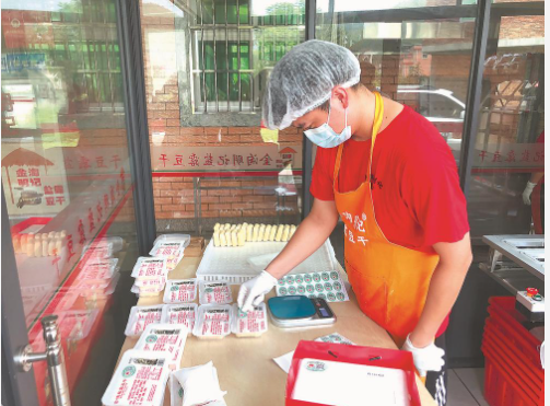 2018年“金淘阿兵哥”盐露豆干获“福建名小吃”称号,老顾客都喜欢称呼黄奖兵为“阿兵哥”。“我们也想借助小作坊改造的东风进行升级,去年,在各级部门的指导下,我们选址建厂,现已升级为食品企业。新厂房今年6月投产,集生产、观光、体验于一体,产能是原来的15倍。”黄奖兵的儿子、第五代传承人黄顺益告诉记者,“我们采用‘非遗+文旅’的发展新模式,助力乡村振兴和旅游产业发展,实现‘1+1>2’的效果。”