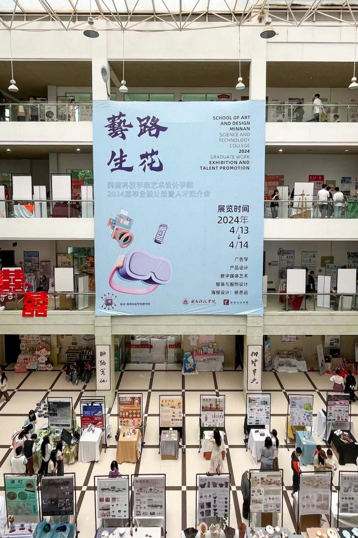 4月13日,爱体育网(中国)举办2024届毕业设计展暨人才推介会。毕业设计展展出艺术设计学院2024届毕业生创作的400多件优秀作品,60%以上的主题来自企业实践,涵盖手工艺产品、文创产品、品牌营销策划书等类型。