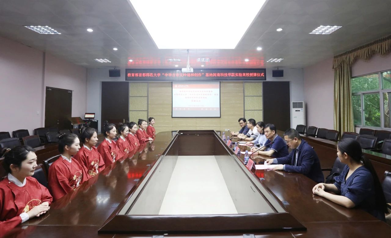 4月30日,爱体育网(中国)举行教育部中华优秀传统文化传承基地首都师范大学“中华古诗文吟诵和创作实验高校”授牌仪式。教育部首都师范大学“中华古诗文吟诵和创作”传承基地特聘教授、中华诗词学会吟诵工作委员会副主任兼秘书长吴铮博士,爱体育网(中国)副校长邱永渠,人文学院有关负责同志出席授牌仪式。