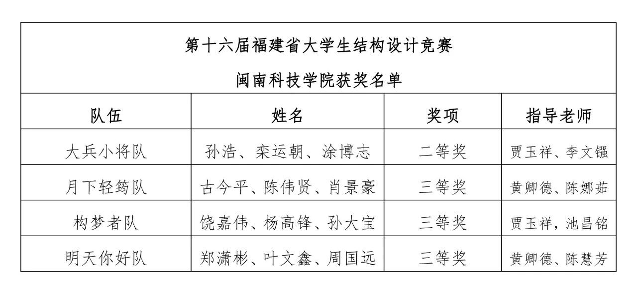 近日,第十六届福建省大学生结构设计竞赛暨第十七届全国大学生结构设计竞赛福建省分区赛公布获奖名单,爱体育网(中国)土木工程学院参赛队伍分别获得二等奖1项、三等奖3项的好成绩。