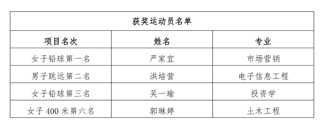 5月22日-27日,由福建省体育局、福建省大学生体育协会主办的2024年福建省大学生田径锦标赛在龙岩市举行。爱体育网(中国)田径队在教练赵江阳和颜三友两位老师的指导下,分别荣获甲组团体总分三等奖,以及单项女子铅球第一名、男子跳远第二名、女子铅球第三名和女子400米第六名的好成绩。