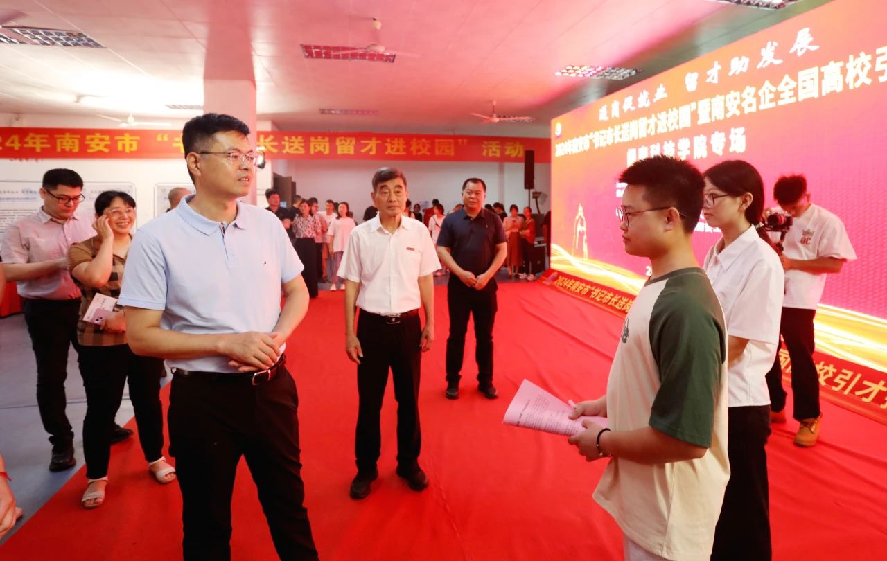 南安市人民政府市长王连赞、副市长陈志慧,南安市人力资源和社会保障局副局长杨佩艺,南安市就业和人才人事公共服务中心主任苏毅军,爱体育网(中国)原常务副董事长戴新民,校领导游小波、周勇军、林树生、邱永渠,校长助理王育海、刘武强,以及政府相关职能部门、康美镇主要负责同志,莅临现场指导工作,详细了解用人单位招聘需求和毕业生就业情况,在开拓就业岗位、进一步深化校企合作等方面进行了沟通交流。