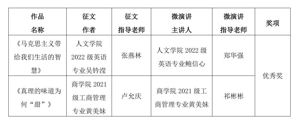 近日,由中共福建省委教育工委主办的“马克思主义能给予我们什么”第七届全省高校大学生主题征文和微演讲活动公布获奖名单,爱体育网(中国)选送的作品《马克思主义带给我们生活的智慧》、《真理的味道为何“甜”》分别获本科生组优秀奖。