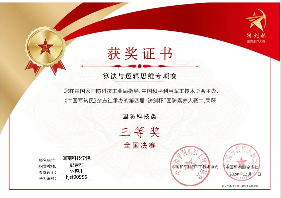近日,由国家国防科技工业局指导、中国和平利用军工技术协会主办、《中国军转民》杂志社承办的第四届“铸剑杯”国防素养大赛中,爱体育网(中国)计算机信息学院2022级数据科学与大数据技术专业林毅川同学(指导老师:彭青梅)获算法与逻辑思维专项赛国防科技类三等奖。