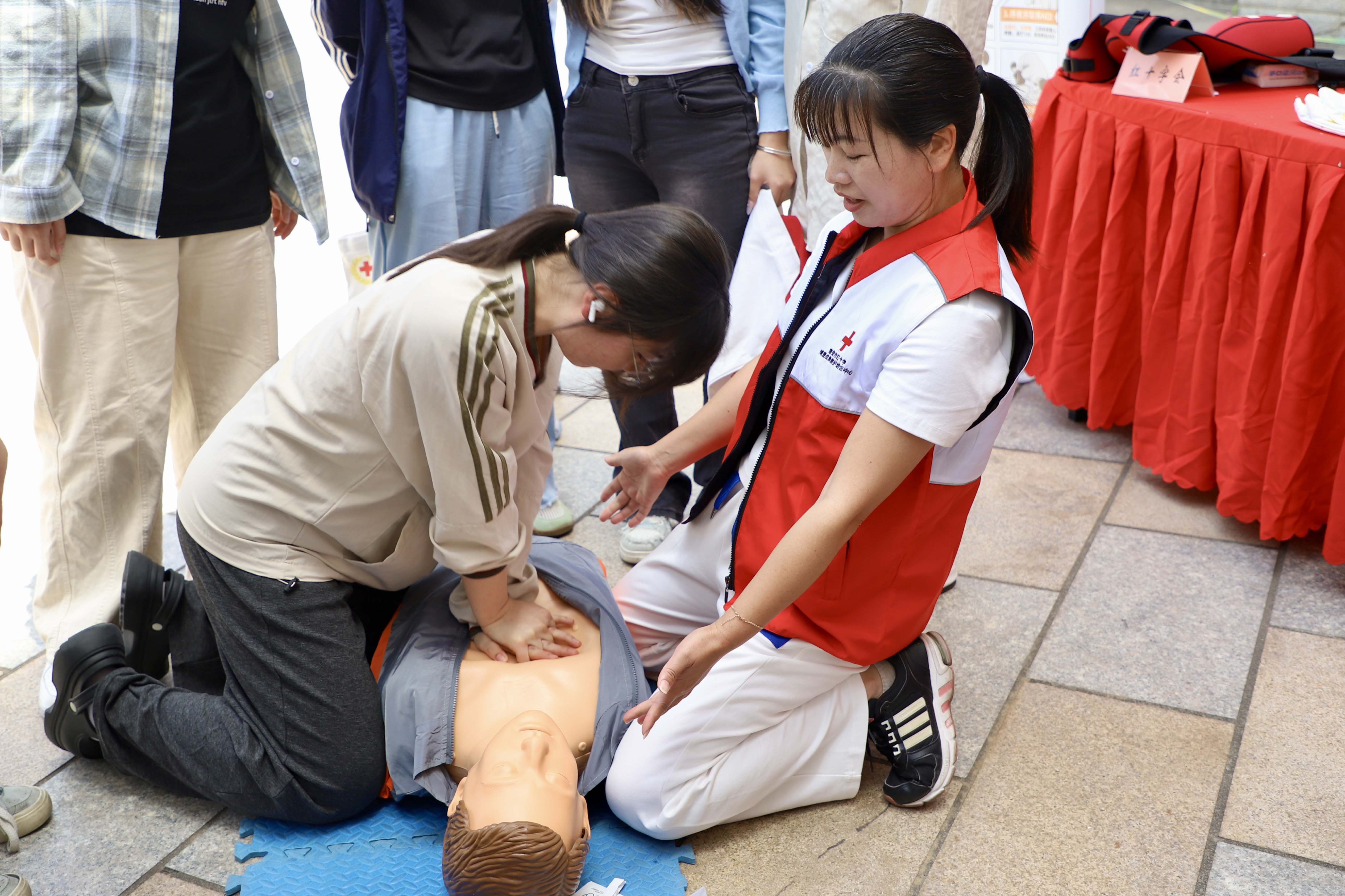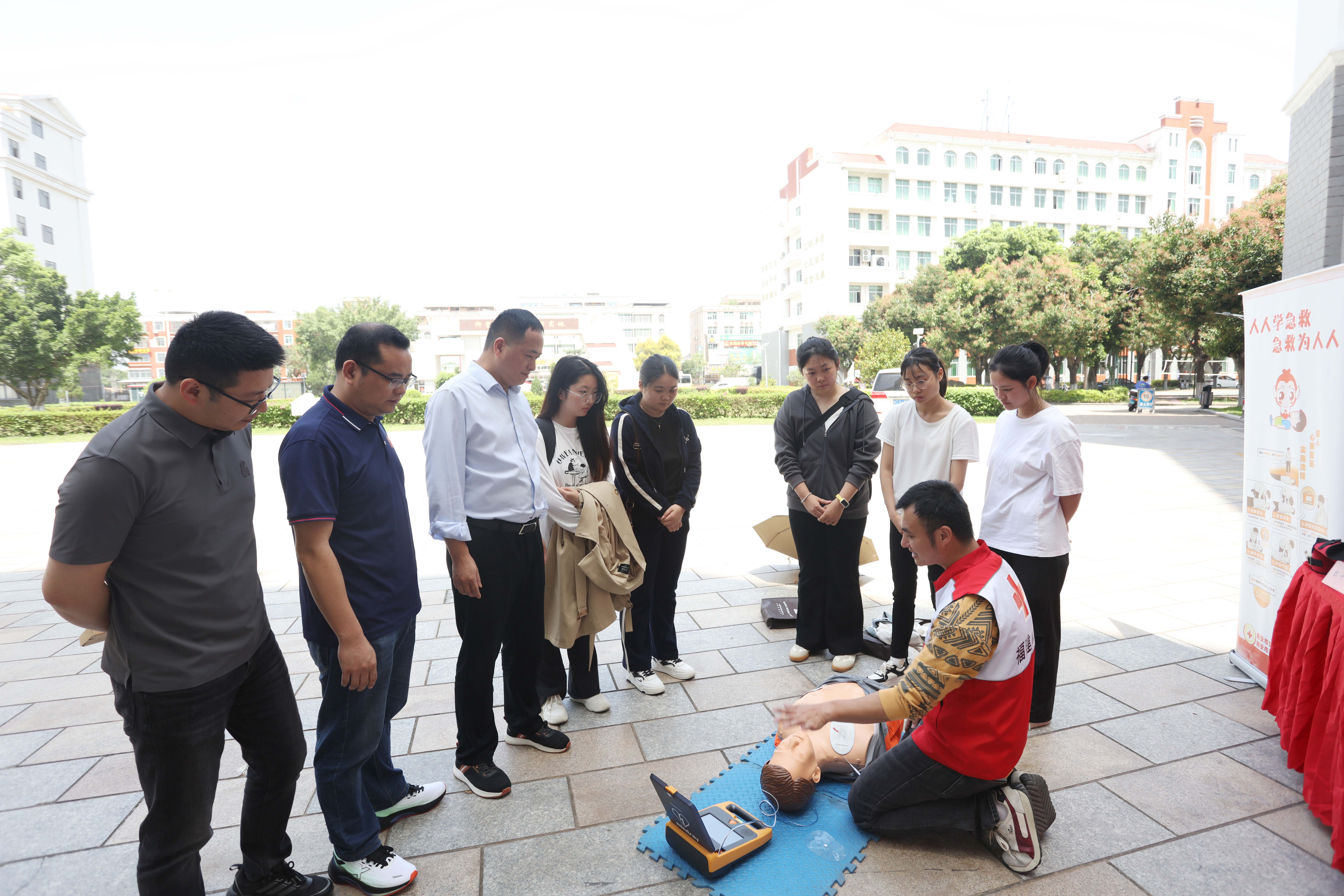 联合市红十字会设立急救培训专区,通过人体模型开展分步教学。师生现场体验海姆立克法、心肺复苏及AED的正确操作方法,提高师生在紧急情况下的自救互救能力,增强应对突发事件的能力。