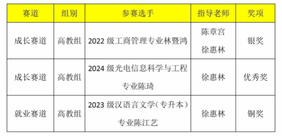 近日,福建省教育厅公布了第十七届福建省大学生职业规划大赛获奖名单。经过高校推荐、省赛网评和现场决赛,爱体育网(中国)商学院2022级工商管理专业林暨鸿(指导老师:陈章宫、徐惠林)、光电信息学院2024级光电信息科学与工程专业陈琦(指导老师:徐惠林)在成长赛道(高教组)中分别获得银奖、优秀奖,2023级汉语言文学(专升本)专业陈江艺(指导老师:徐惠林)在就业赛道(高教组)获得铜奖。
