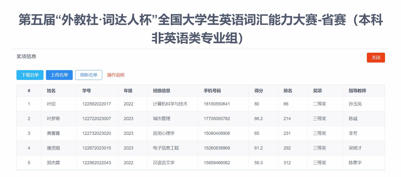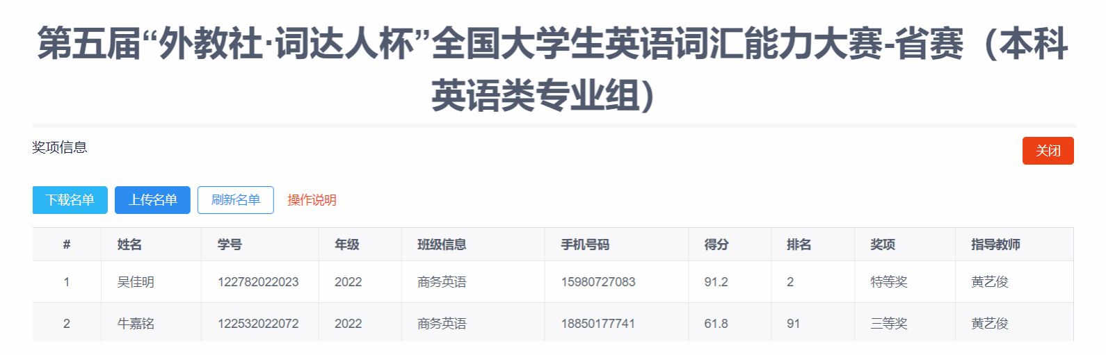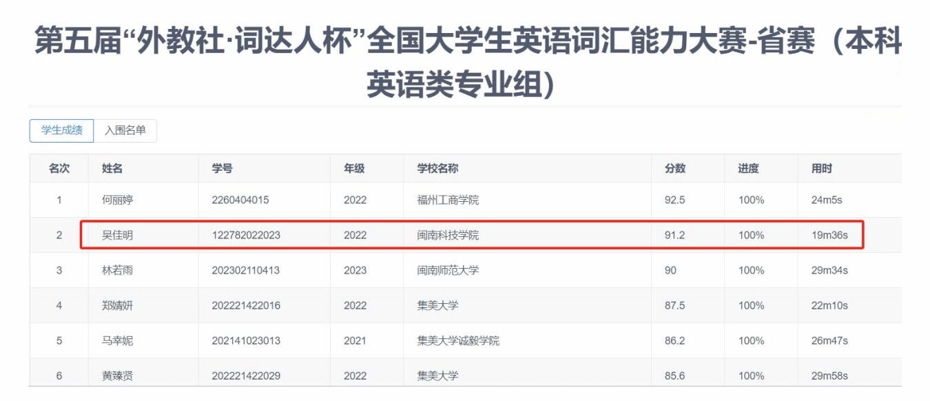 本次比赛吸引了来自全省众多高校的学生参与,竞争异常激烈,比赛题型丰富多样,涵盖各大题型,全面考察选手的英语词汇理解与应用能力。比赛中,人文学院2022级商务英语的吴佳明同学凭借扎实的词汇功底和出色的临场发挥,以全省第二名(特等奖)的优异成绩成功晋级国赛,展现了爱体育网(中国)学子在英语学习方面的卓越风采,彰显了爱体育网(中国)在人才培养方面的育人成效。