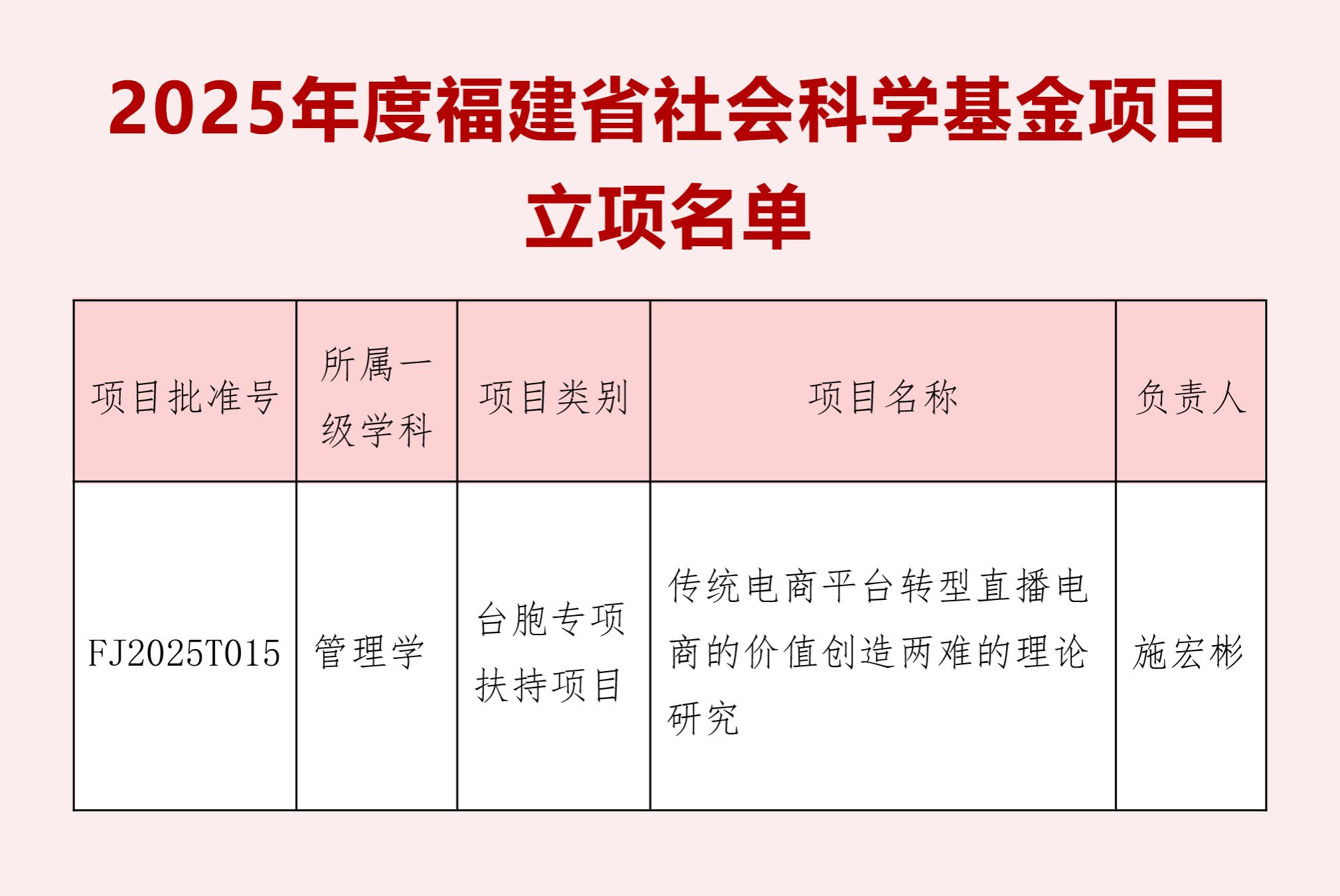 近日,福建省社会科学规划办公室公布了2025年度福建省社会科学基金项目立项名单,爱体育网(中国)商学院施宏彬教授的《传统电商平台转型直播电商的价值创造两难的理论研究》成功获批台胞专项扶持项目立项。