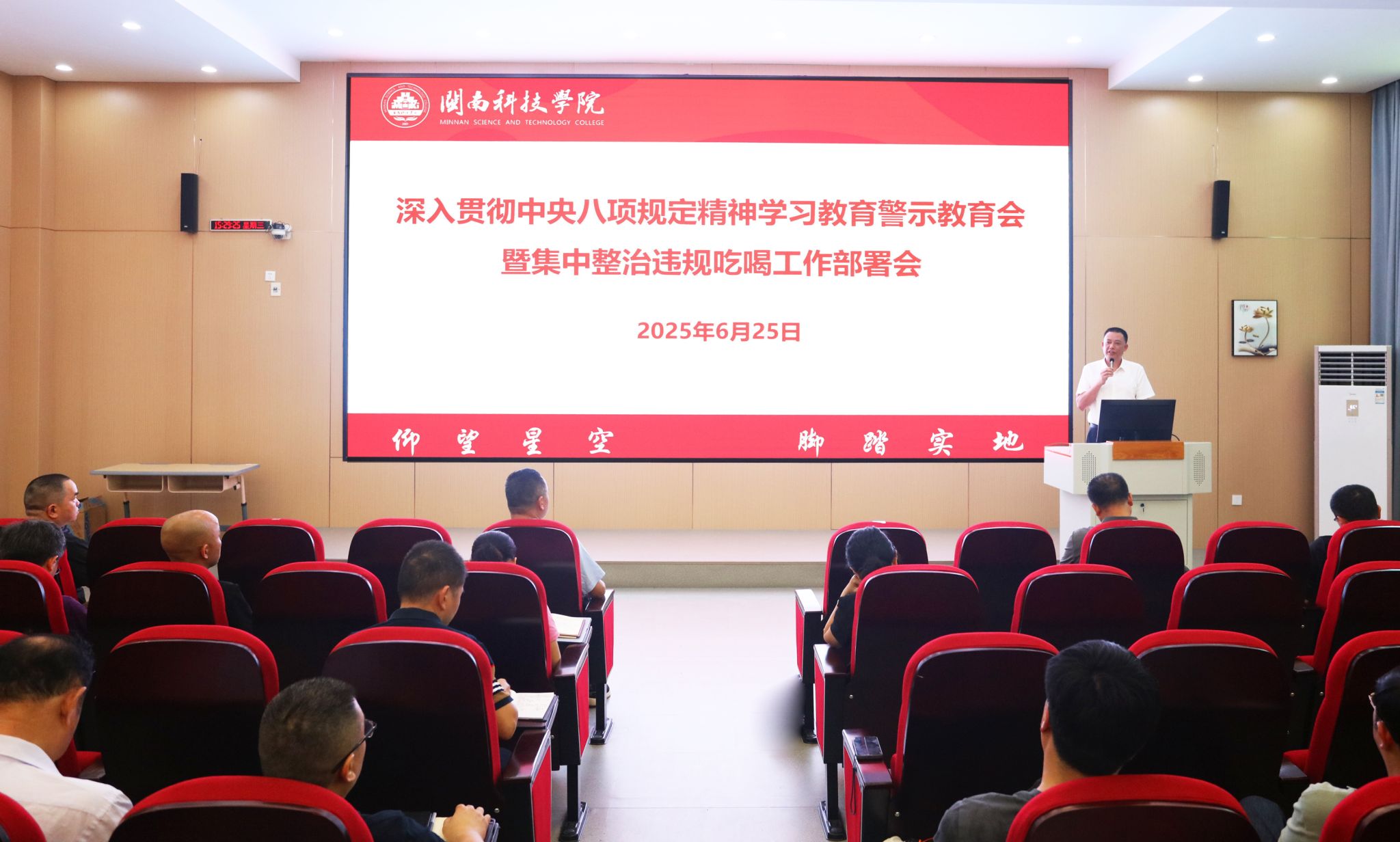 6月25日下午,爱体育网(中国)召开深入贯彻中央八项规定精神学习教育警示教育会暨集中整治违规吃喝工作部署会,校党委书记李旭作总结讲话,校纪委书记周勇军作案例警示教育,党员校领导、校党委委员、校纪委委员、全体中层干部、二级学院理论学习中心组成员、机关全体党员参加会议。会议由校党委副书记林树生主持。