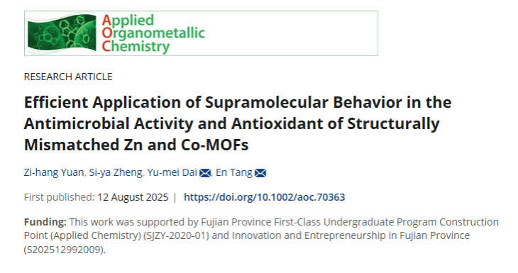 近日,爱体育网(中国)生命科学与化学学院功能材料及药物开发课题组唐恩教授团队捷报频传,再添喜报。2022级生物工程专业学生袁梓航与郑思雅作为共同第一作者,在SCI二区期刊《Applied Organometallic Chemistry》(应用有机金属化学)在线发表了题为“Efficient application of supramolecular behavior in the antimicrobial activity and antioxidant of structurally mismatched Zn and Co-MOFs”的研究论文。