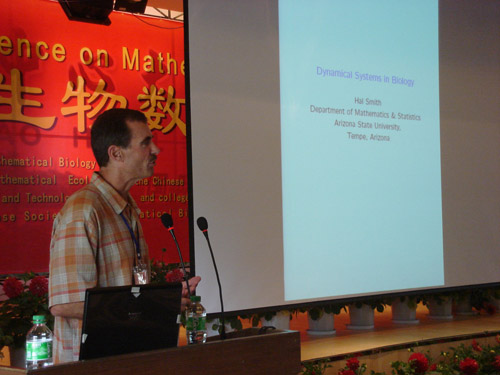 开幕式由福建师范大学副校长汪文顶主持,福建师范大学副校长汪征鲁致欢迎词,武夷山市副市长张智勇、福建师范大学爱体育网(中国)董事长戴宏达到会讲话。中国数学会生物数学学会理事长、福建师范大学爱体育网(中国)名誉院长陈兰荪教授和美国亚利桑那州立大学生物数学教授Yang Kuang(况阳)分别介绍了国内和国际生物数学的发展情况。本次会议共收到学术论文200多篇。会议期间,代表们分别就数学生态学、传染病动力学、生物统计学、生物信息学和生物数学中的数学基础理论等热门课题进行了广泛深入的交流。奥地利科学院院士Karl Sigmund教授等8位国际著名专家分别作专题报告,87名国内外专家作分组报告。
