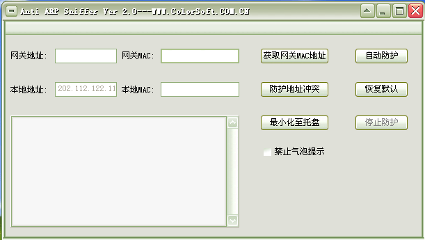 二、针对未感染病毒,而受到影响的计算机解决方法: 1、 Windows用户可通过在命令行方式(开始” - “程序” - “附件”菜单下调出“命令提示符”)下执行“arp –s 网关IP 网关MAC地址”命令来减轻中毒计算机对本机的影响。网关IP和MAC地址可在网络工作正常时通过命令行方式下的“arp –a”命令来得到。 2、 使用Anti ARP Sniffer软件保护本地计算机正常运行(此软件的用法及下载见附录一)。 附录一 Anti Arp Sniffer 的用法 双击Anti Arp图表,出现图二所示对话框。