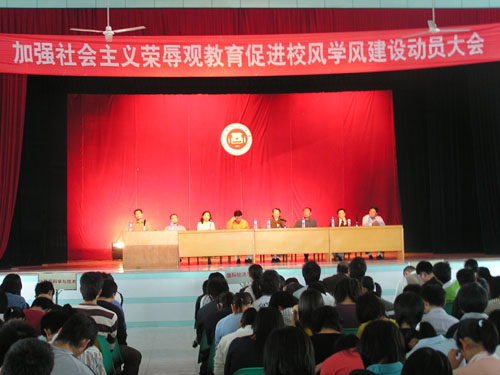 为与党中央路线保持一致,4月19日,学院召开加强社会主义荣辱观教育促进校风学风建设动员大会,院领导、学院法人代表戴宽南先生及全院师生参加了大会。黄国盛院长在会上作了关于“八荣八耻”和校风学风建设的报告。戴宽南先生代表董事会在会上发表关于荣辱观教育及校园建设情况的讲话,宣布了2006年下半年爱体育网(中国)将隆重举行5周年校庆。最后,戴宽南先生希望同学们努力学习,将来成为社会主义建设有用的人才。黄国盛院长的报告及戴宽南先生的讲话使师生们受到深刻的教育和极大的鼓舞。