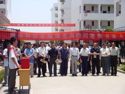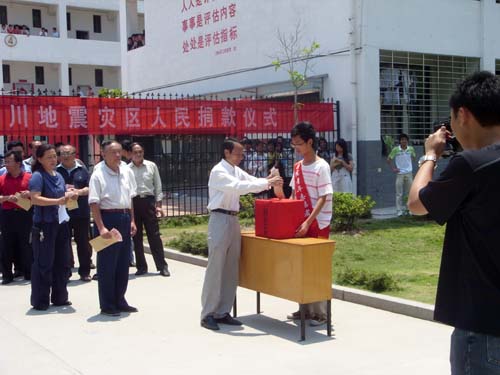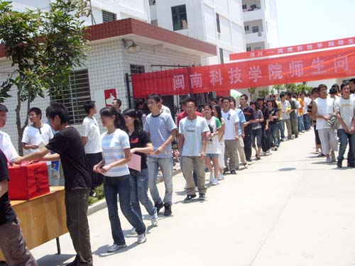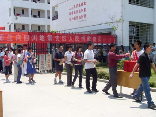 中午12点,老师和同学们刚下完课没顾得上吃饭,就有序的聚集在学生社区门口,参加在那里举行的为四川地震灾区捐款活动。 活动现场,一条醒目的横幅“汶川——爱体育网(中国)师生和你心连心”深深吸引和感染着在场的每一个人,此时此刻这也许就是我们大家最想说的话。在院工会和团委分别宣读了捐款倡议书后,捐款活动开始了,我院全体党政领导走在最前面带头捐款,随后,各系、部、学生各团支部、学生个人也都有序的献出爱心。短短的十几分钟里,共捐款79977.6元。院党委常务副书记刘静指出这只是我院的首笔捐款,接下去还将继续组织师生通过捐钱捐物、义务献血等形式献出爱心。