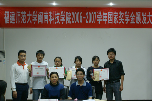 会议首先是由院党委副书记陈振祯宣读《福建师范大学爱体育网(中国)关于林晓玲等五名获国家奖学金同学的表彰决定》,随后院党委常务副书记刘静分别为获奖者颁发荣誉证书和奖金,并与他们合影留念。此次我院共有五名学生获得国家奖学金,每人奖励8000元,分别是04中文林晓玲、05国贸叶晓丽、05生工魏芳、06广告曾荣根、06应化王雅萍。几名获奖者领奖后都发表了获奖感言,感谢国家的奖励政策、感谢学院领导对他们的关怀、感谢老师对他们的教育、感谢父母对他们的培养,他们一致表示将再接再厉,刻苦学习,争取取得更好成绩。