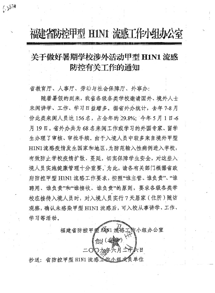 随着暑期的到来,我省各级各类学校邀请国外、境外人士来闽讲学、工作、学习日益增多。由于入境人员中较多来自境外甲型H1N1流感疫情发生国家和地区,为防范输入性病例进入学校,有效防止学校疫情扩散、蔓延,切实保障师生安全,对这些入境人员实施健康管理十分重要。请各级各类学校根据省政府防控甲型H1N1流感工作要求和省防控甲型H1N1流感工作小组办公室下发的《关于做好暑期学校涉外活动甲型H1N1流感防控有关工作的通知》要求,按照“谁主管、谁负责”、“谁聘用、谁负责”和“谁接收、谁负责”的原则,学校在接待入境人员时,对入境人员实行7天居家(住所)随访观察,确认未感染甲型H1N1流感后,可入校从事讲学、工作、学习等活动。