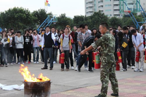 随后,消防中队的消防救援人员们在篮球场进行了灭火演练活动。通过消防救援人员的现场示范指导,参与演练的同学们学会了如何正确的使用灭火器灭火等知识。