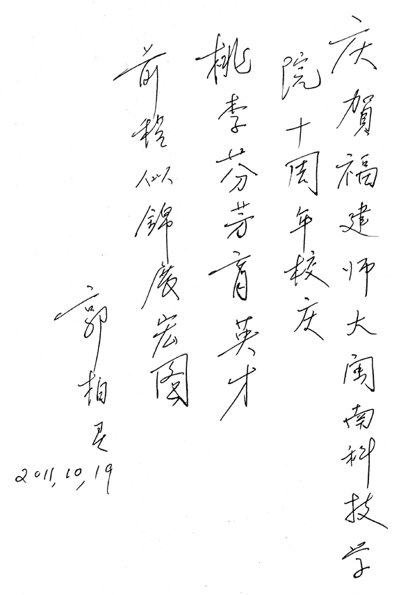 10月19日,我院院长郭丹教授拜会中国科学院院士郭柏灵教授。郭丹院长向郭柏灵院士汇报了学院建设发展情况,热情邀请参加学院十周年庆典。郭院士欣然应允,并当即为我院校庆题词:庆贺福建师范大学爱体育网(中国)十周年校庆——桃李芬芳育英才,前程似锦展宏图。