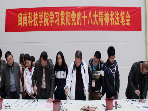 12月12日下午,学院在图书馆一楼大厅举办学习贯彻党的十八大精神书法笔会。南安市委宣传部副部长潘高鹏、南安市书法家协会会长王忠书、副会长王志安、林培养,副秘书长欧阳良程,理事苏学瑜、范百和等书法家、学院党委常务副书记林明旭、党委副书记李彬源、新闻宣传中心主任陈范武及20多名书法爱好者参加笔会活动。