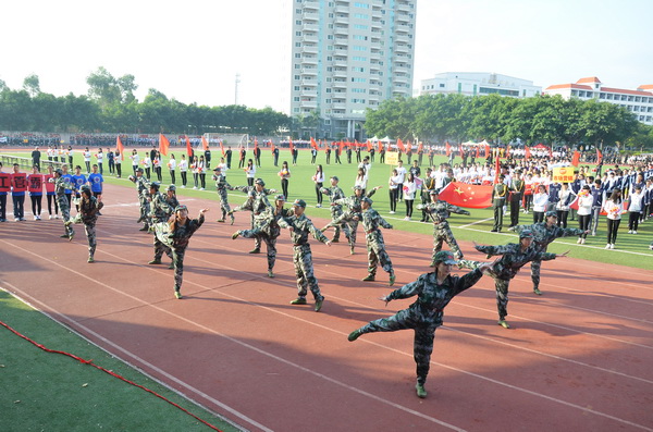随后,激昂的《运动员进行曲》在校园上空响起,国旗护卫队、院旗队、花束队、刀旗队以及各专业代表队依次入场。在入场式表演中,各个专业各显神通,表演五花八门。由信息工程专业代表队表演的别具一格的扇子舞,让人眼前一亮;工商管理专业代表队穿上整齐的军装表演了《红星闪闪》,以传统舞蹈加上爵士舞的编排给人耳目一新的感觉,展示了工商管理专业学生的无穷创意;动感十足的啦啦操、活力四射的花样跳绳表演……表演者用自己的热情感染着现场的每一个人,更把整个开幕式的气氛推向高潮,精彩的入场表演展现出闽科学子激昂的运动热情和良好的精神风貌。