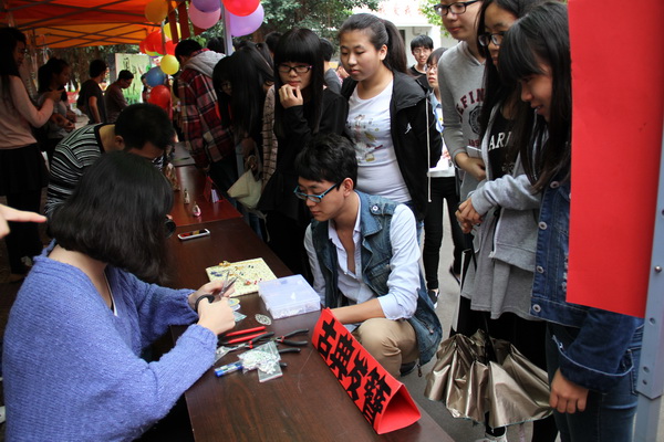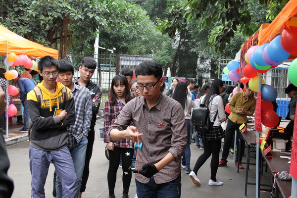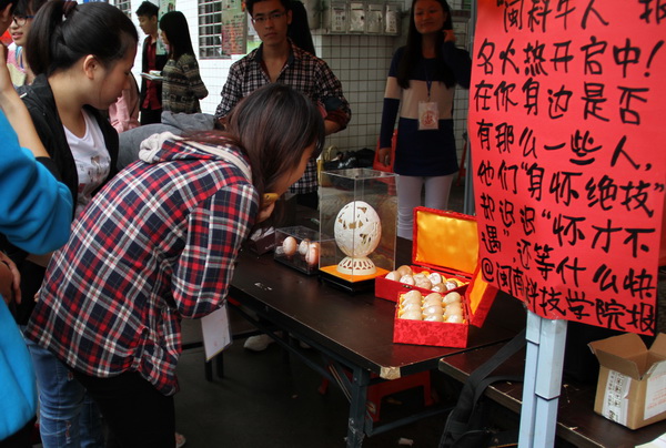 古典发簪、布艺钱包、蛋雕、橡皮雕、悠悠球展示吸引许多同学。来自外语系2012级英语专业王雨思在现场一剪一贴,精湛的技艺引来众多女生驻足观看;计算机科学系 2012级数字媒体艺术吴偿德制作的“蛋雕”作品,巧夺天工的技艺,精致的作品是整个展览中的“人气王”;人文艺术系2012级服装设计与工程专业学生黄琨琨表演悠悠球,玩法多样,技巧娴熟,赢得阵阵掌声。有不少同学现场报名参选“闽科牛人”。