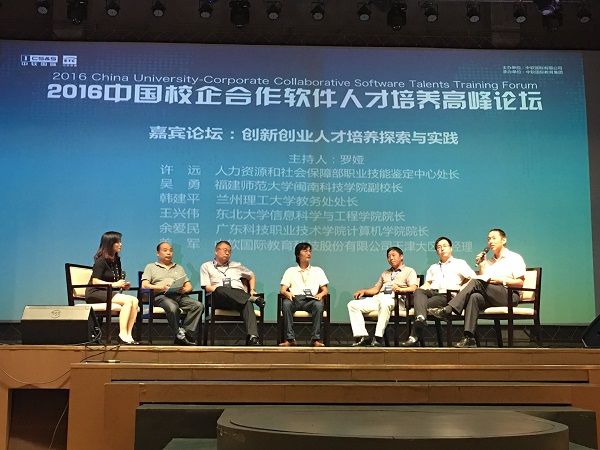 在2016年教育部产学合作专业综合改革和国家大学生创新创业训练计划项目研讨会暨中国校企合作软件人才培养高峰论坛(第七届)上,吴勇副院长代表学院与中软国际签定项目合作协议,并在“创新创业人才培养探索实践”嘉宾论坛上发言。他全面分析了新形势下独立学院校企深度合作的方向和内涵,重点介绍了我院近年来在大学生创新创业训练计划项目方面所取得的经验和成果。