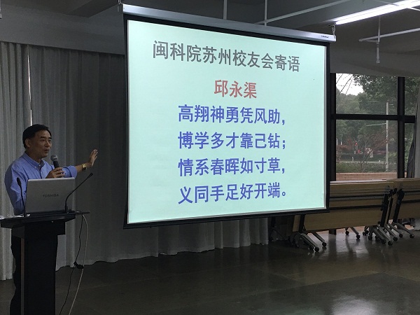 邱永渠院长代表学院董事会、党政领导向苏州校友会的成立表示热烈的祝贺。他赋诗《闽科院苏州校友会寄语》:高翔神勇凭风助,博学多才靠己钻。情系春晖如寸草,义同手足好开端。表达了对校友会所寄予的祝福和厚望。他希望苏州校友会今后能够积极发挥桥梁纽带作用,努力为长三角地区的校友提供沟通交流、增进往来、促进合作的平台,把苏州校友会办成广大校友的温馨家园,团结和带领广大校友和母校一道共同推进我院侨乡特色的应用技术型民办学院建设。