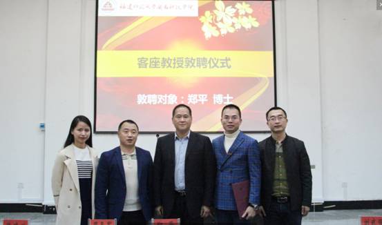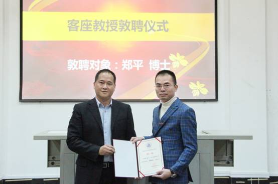 讲座前还举行了客座教授敦聘仪式,学院副院长周勇军为郑平博士颁发客座教授聘书,并为其配戴校徽
