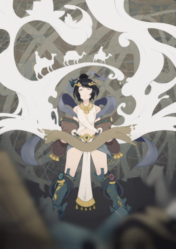 《曾见汝皇》以游戏角色孙膑为人物原型,结合“穿越时空”的背景故事进行数码手绘创作,褪色的画、丝绸之路、郑和下西洋等元素交织融汇,展现敦煌文物昔日辉煌和沉封的现境。