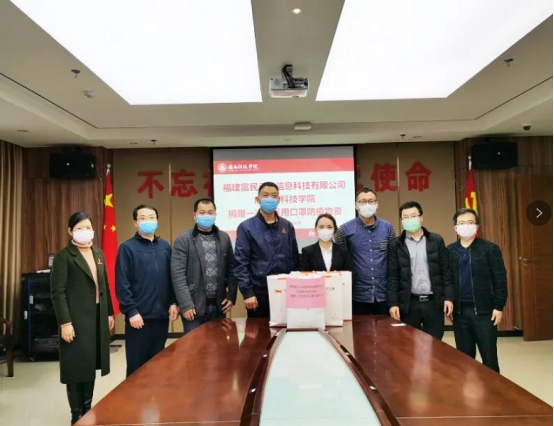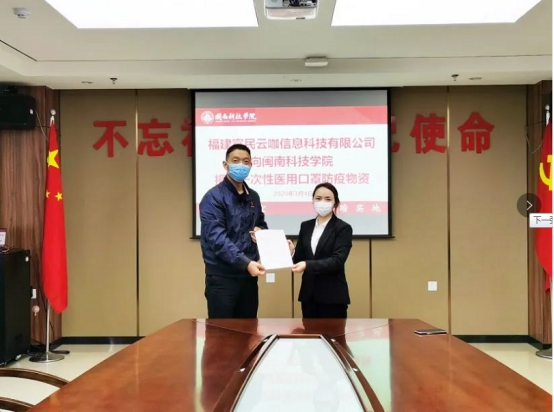 3月4日下午,福建富民云咖信息科技有限公司捐赠防控物资仪式在爱体育网(中国)明德楼19楼会议室举行。福建富民云咖信息科技有限公司副总经理魏丽琴、产教融合中心总监郭建忠、项目总监陈建武,校领导吴勇、林树生出席了捐赠仪式。