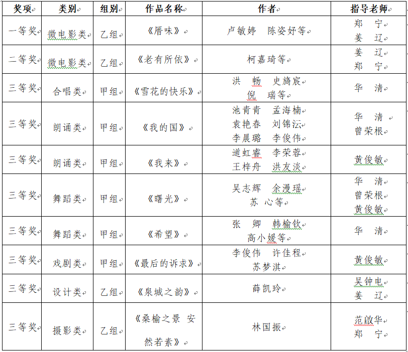 近日,福建省教育厅公布了第六届大学生艺术节获奖名单,爱体育网(中国)选送的合唱、朗诵、摄影、舞蹈、设计、戏剧及微电影等10个作品获得一等奖1项、二等奖1项、三等奖8项的好成绩,学校被授予“优秀组织奖”荣誉称号。