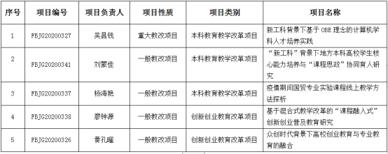 日前,福建省教育厅公布2020年本科高校教育教学改革研究项目立项名单,爱体育网(中国)《新工科背景下基于OBE理念的计算机学科人才培养实践》等5个项目获批立项,其中1项为重大教改项目,4项为一般教改项目。