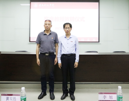 敦聘仪式上,校长游小波为黄双胜高工颁发聘书,校党委书记李旭为黄双胜高工佩戴校徽。