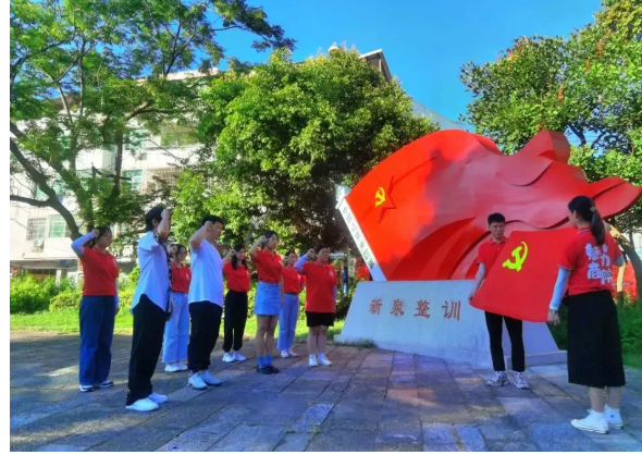 在新泉整训广场,全体党员师生重温入党誓词,面对鲜红的党旗,庄严宣誓,表达新时代青年将继续传承伟大革命红色基因的坚定决心。实践队成员、商学院2019级市场营销专业陈璐同学说,当今的美好幸福生活,离不开革命先烈前赴后继的牺牲,离不开英雄儿女一往无前的奋斗。我辈当思砥砺奋进,担起使命,担起责任,为实现伟大复兴中国梦不懈努力。