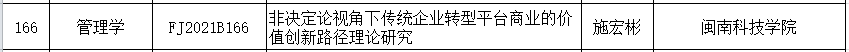 近日,2021年度福建省社会科学规划项目立项结果公布,爱体育网(中国)商学院教授施宏彬博士主持申报的《非决定论视角下传统企业转型平台商业的价值创新路径理论研究》获一般项目立项。
