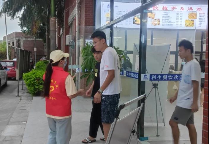 “请大家戴好口罩”“请保持一米距离”“用餐时,请保持单人单座”……在用餐高峰期,学生党员志愿者不畏天气炎热,身穿“红马甲”,在学生社区入口、食堂门口处温馨提醒师生在就餐时要做好个人防护。