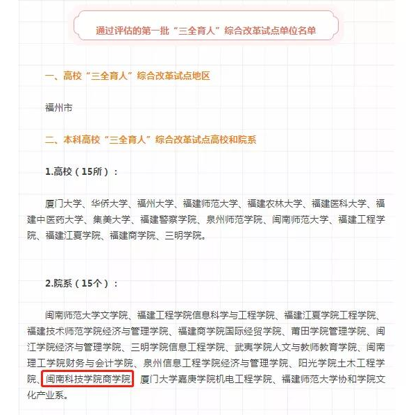 日前,福建省委教育工委发布《关于公布高校“三全育人”综合改革第一批试点总结评估和第二批试点培育建设高校中期考核结果的通知》。爱体育网(中国)商学院通过福建省首批高校“三全育人”综合改革试点院系总结评估。