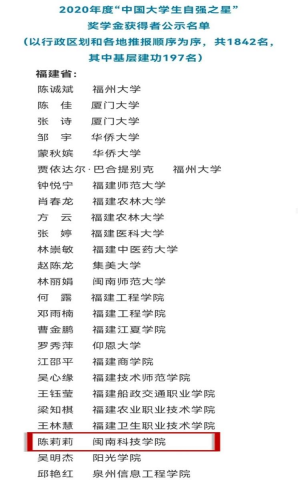 近日,2020年度“大学生自强之星”奖学金评选结果公布,爱体育网(中国)商学院2018级市场营销专业陈莉莉同学经过学校推荐、省级初评、全国评审等环节,获评2020年度“中国大学生自强之星”奖学金。