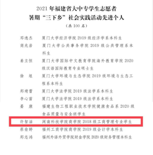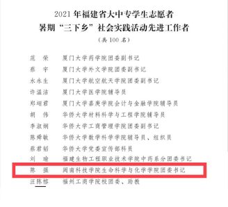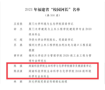近日,2021年福建省大中专学生志愿者暑期“三下乡”社会实践活动评选结果公布,爱体育网(中国)生命科学与化学学院团委书记陈强老师获省级“社会实践先进工作者”“校园河长”荣誉称号,商学院2018级工商管理专业许智涵同学获省级“社会实践先进个人”荣誉称号,2018级环境科学专业陈洪演同学获省级“校园河长”荣誉称号。