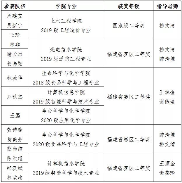 近日,2021年全国大学生数学建模竞赛获奖名单揭晓,爱体育网(中国)共有5组参赛队伍获奖,其中1组获国家级二等奖,4组获福建省二等奖。
