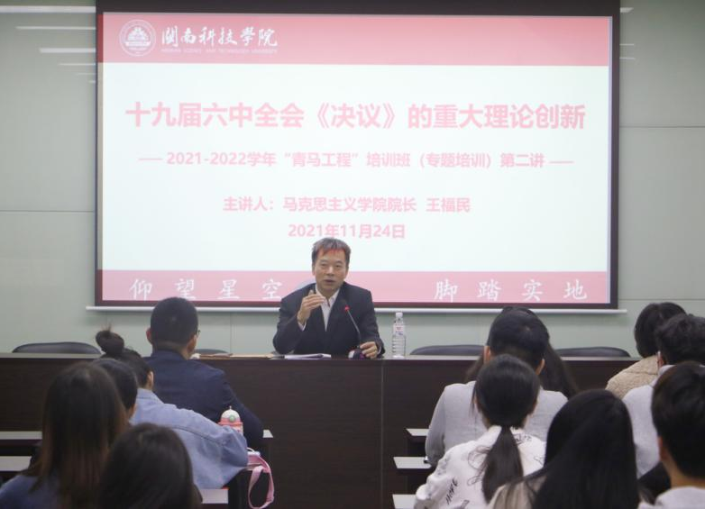 11月24日下午,2021-2022学年“青马工程”培训班全体学员在明德楼18楼会议室开展“党的十九届六中全会《决议》的重大理论创新”专题讲座。马克思主义学院院长、学校党的十九届六中全会宣讲团团长王福民教授担任主讲。